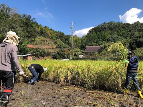 台風一過の… 稲刈り〜〜!!! 足元がぬかるんできて足抜けないっ! 刈っても、畔まで穴を持って行くのが大変。 途中にトタンも置いて工夫するも やっぱりこけたよね 午後からは子ども達も頑張って ハザ掛け〜〜〜!!! 無農薬で 全て手作業で ハザ掛けもし…